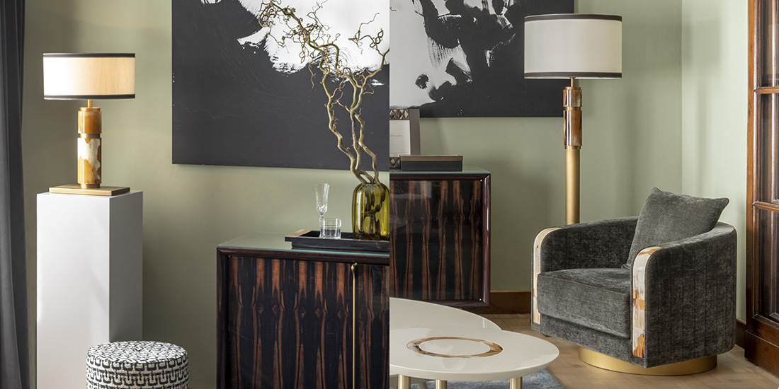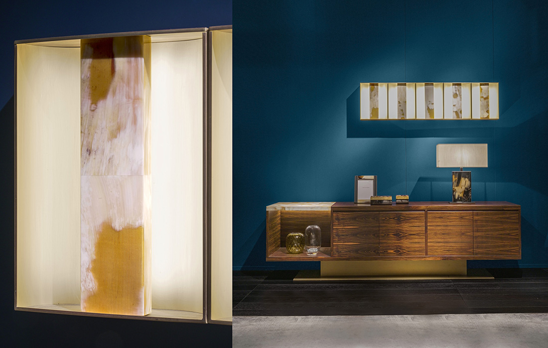 В качестве примера расскажем об известных светильниках ARCAHORN. Настольная лампа и торшер из коллекции Babel сделаны из сатинированной латуни, дополненной вставками из изогнутого полированного рога. Абажуры выполнены из шёлка шантунг цвета слоновой кости с отделкой по краям из тёмно-коричневой кожи. Такое сочетание материалов позволяет мягко рассеивать свет, подчёркивая естественные тёплые оттенки и текстуру рога.