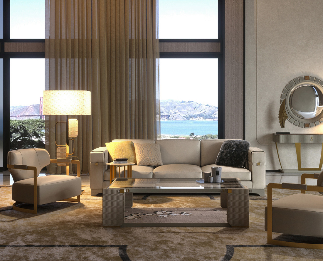 Торшер WAVE в украшен изогнутыми деталями из золотого металла, которые эффектно контрастируют с панелями из стёганой кожи. К светильнику прилагается тканевой абажур.