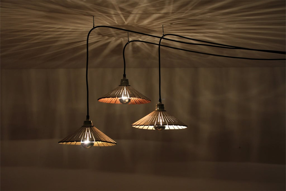Светильники dukta RAYA состоят из цельного куска круглой фанеры с вырезанными концентрическими узорами. Благодаря оригинальным креплениям плафоны можно соединять друг с другом, формируя из них единую конструкцию. Цветные внутренние элементы в сочетании со светодиодными лампами с зеркальным покрытием создают тёплую атмосферную подсветку и отбрасывают интересный световой рисунок. Модели могут также монтироваться на стену, если использовать специальные крепления.