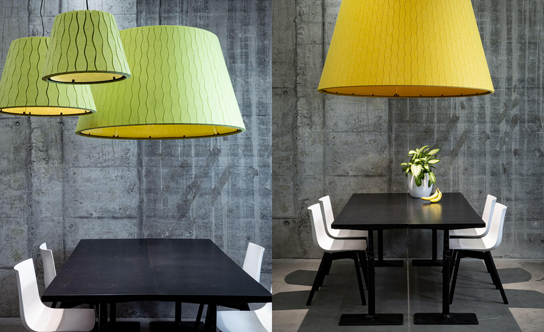 Акустический подвес EchoLED CONE от бренда ECHOJAZZ выполнен в форме конуса. Модель предназначена для открытых пространств. В зависимости от выбранного размера в одном абажуре может содержаться до 360 переработанных бутылок. Благодаря разной толщине материала, широкой палитре цветов и вариативности дизайна, эти светильники позволяют гибко настраивать акустику и освещение в офисах, ресторанах или жилых домах.