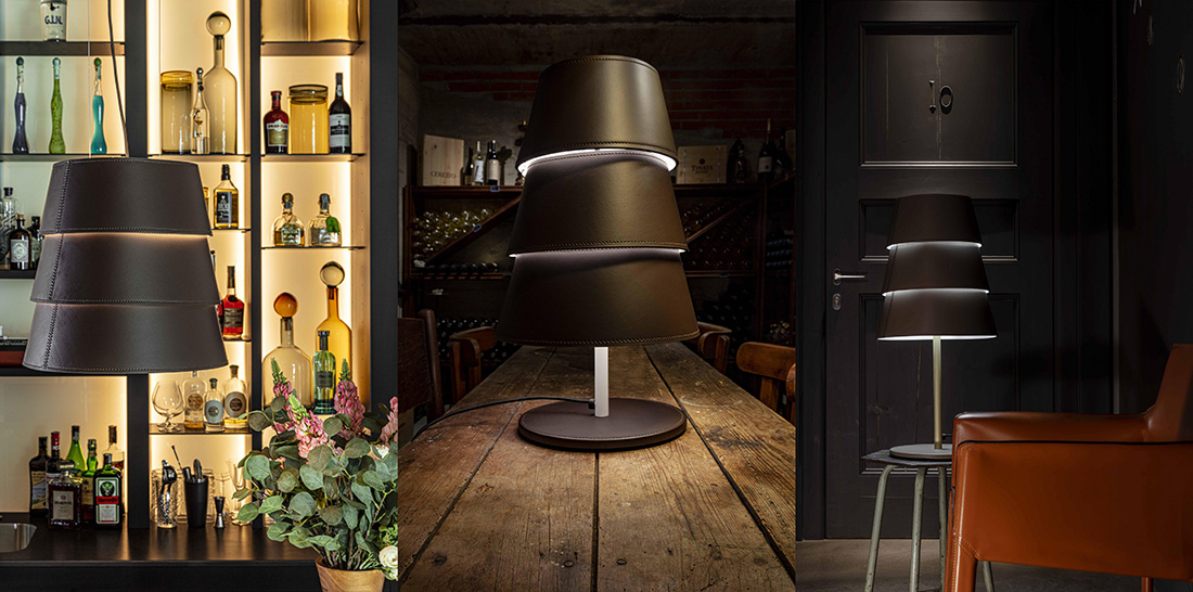 Серия ENRICO PELLIZZONI Tulip состоит из напольной, настольной и подвесной версии. Основание ламп выполнено из латуни, а абажуры сделаны из кожаных лент, частично перекрывающих друг друга. Кожаные детали аккуратно прошиты нитью в цвет материала. Светильники оснащены современным светодиодным источником света.