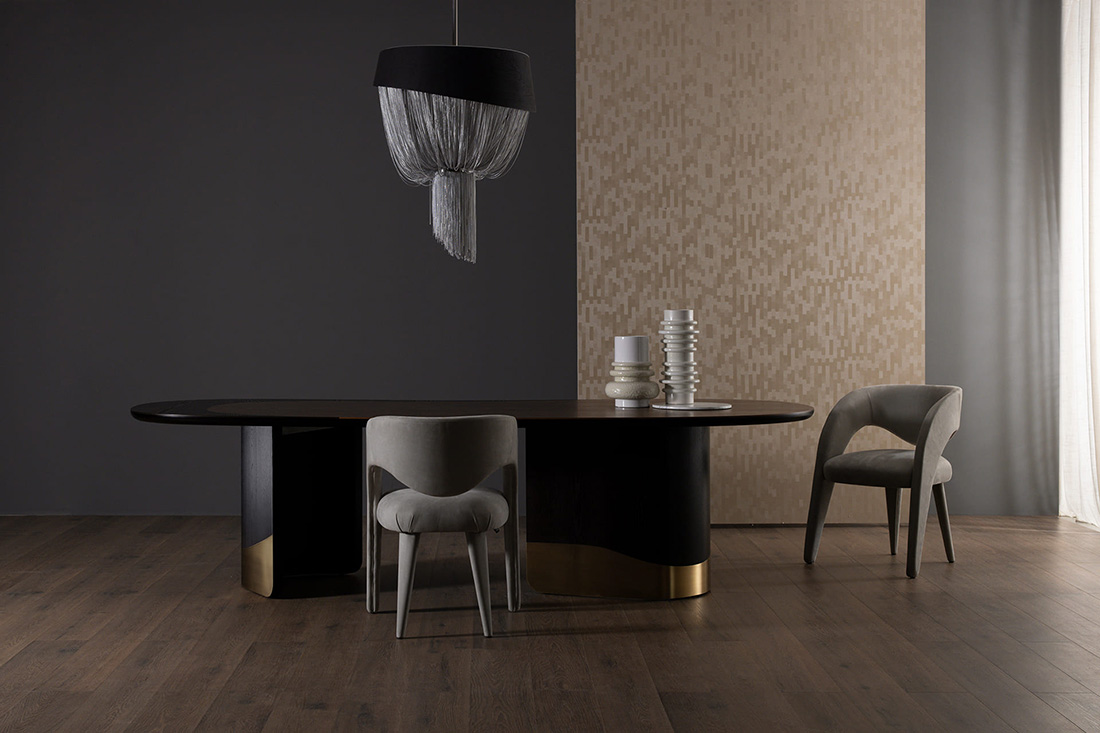 В люстре Forever компания Greenapple переосмысливает эстетику ювелирных украшений, превращая классическую форму в современный арт-объект. Конструкция выполнена из полированной зеркальной стали, которая контрастирует со вставкой из шпона американского дуба в тёмно-коричневом оттенке. Динамику и лёгкость конструкции придают каскады из матовых алюминиевых цепей. Они мягко рассеивают свет, создавая в интерьере приятную атмосферу.