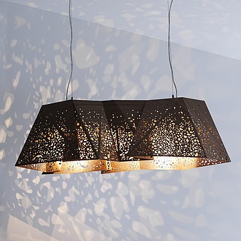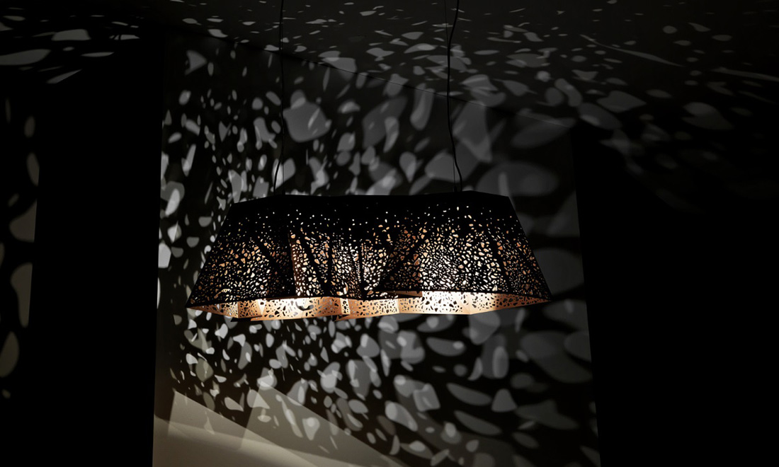 Популярная люстра Horm Plywood Chandelier — скорее светящаяся скульптура, чем просто светильник. Она сделана из материала 2 миллиметра толщиной, состоящего из слоёв орехового дерева и ткани, его складывают наподобие оригами. Абажур похож на кружево благодаря лазерной резке. Свет проходит через прорезанные отверстия и создаёт удивительную игру теней.