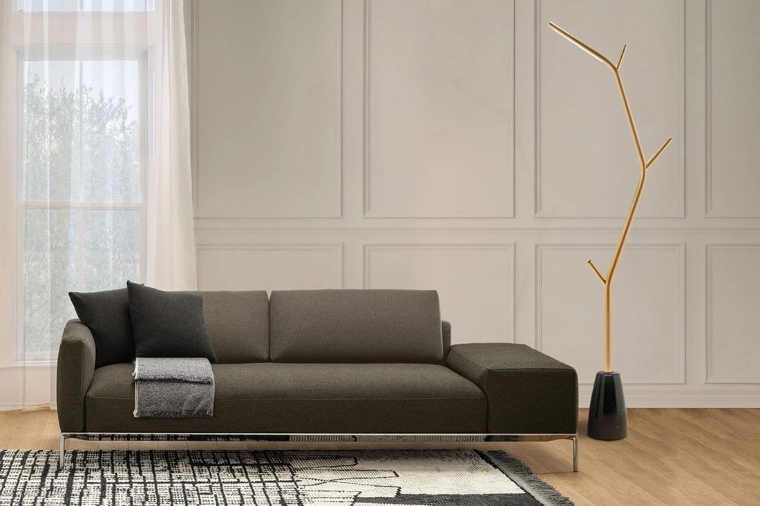 Другой интересный светильник компании — светодиодный торшер Aira с латунной конструкцией, окрашенной в сатинированный золотой цвет. Основание сделано из белого каррарского мрамора или чёрного мрамора Marquina. Оригинальная лампа ломает классические шаблоны роскоши, но вместе с этим привносит природные и даже мифологические мотивы в интерьер, напоминая о дереве как о символе жизни, мира и знаний.