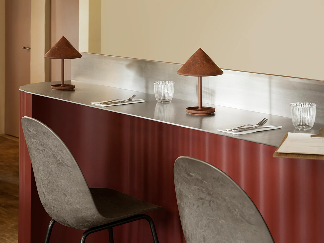 У фабрики есть собственная разработка — материал Matek, который она активно использует в своих изделиях. В его составе Matek могут использоваться кофейные отходы, пластиковые фракции, древесные остатки и другие переработанные компоненты. Технология позволяет получать устойчивые продукты с минимальным углеродным следом, сохраняя при этом высокие эксплуатационные свойства. Материал можно окрашивать, отливать в сложные формы и комбинировать с другими материалами, что делает его универсальным для мебели и освещения. Он разработан как альтернатива традиционным пластикам и композитам, но с гораздо меньшим экологическим воздействием.