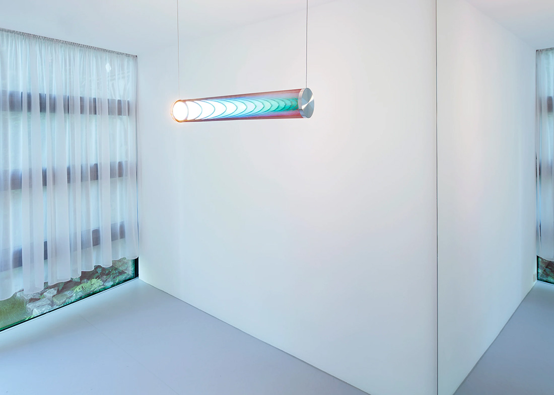 Подвесной светильник NEO/CRAFT Iris Tube создаёт впечатляющие визуальные эффекты. Источники света расположены на противоположных концах цилиндра. Отражения внутри стеклянной трубки создают впечатление светящейся чешуи с меняющимися цветами и отражениями. Этот образ динамичный, он меняется в зависимости от яркости, угла и окружающей среды.