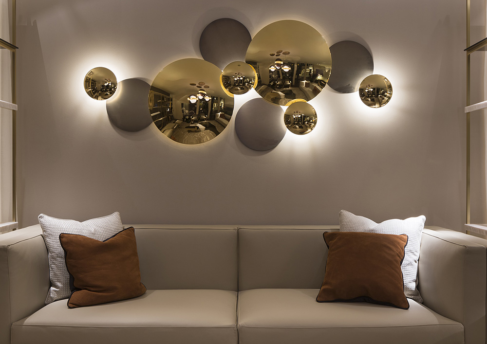 Популярный светильник итальянской компании — бра Galaxy. Сочетание форм и отражений превращает его в подобие скульптуры. Бра состоит из нескольких выпуклых металлических дисков с зеркальным золотым покрытием и нескольких латунных дисков, покрытых матовой бронзой.