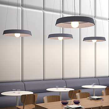 У компании Pujol Iluminacion есть серия акустических светильников Acustic. Это довольно разнообразная коллекция бра и люстр из стекла и полиэтилена. Вокруг стеклянного рассеивателя расположен элемент из акустического материала, который выполняет декоративную и звукопоглощающую функцию, а также служит абажуром. Такие изделия хорошо подойдут для офисов, ресторанов и других шумных мест.