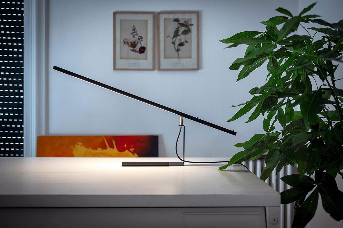 Светодиодная настольная лампа STR01 сделана из экструдированного алюминия и гнутого листового железа с чёрным порошковым покрытием. Соединения выполнены из латуни. Рассеиватель из акрилового стекла можно поворачивать.