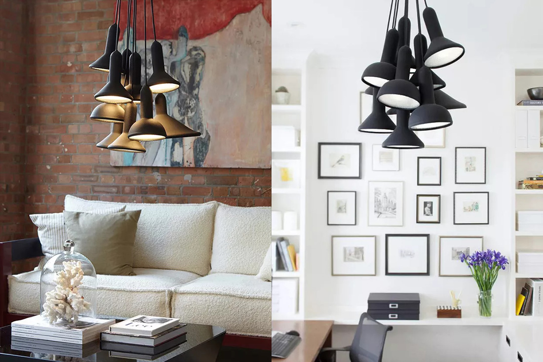 В подвесах TORCH Sylvain Willenz использует мягкий полимер с матовой зернистой фактурой. Форма напоминает ручной фонарик, а прозрачный поликарбонатный рассеиватель — автомобильную фару. Светильник выпускается как одиночный элемент или в виде связок из 5, 10 или 20 ламп.