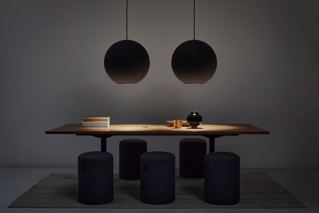 Расскажем о некоторых светильниках от Thomas Bernstrand. Moon — это серия акустических подвесов. Корпус выполнен из полиэстерового войлока, под которым скрыт звукопоглощающий слой из переработанного пластика. Форма — сфера со скрытым внутри конусом — обеспечивает поглощение высоких и низких частот и создаёт чистый визуальный образ без лишних деталей.