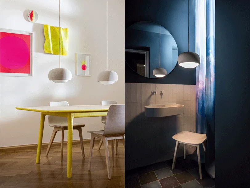Серия светильников ZEITRAUM GEMA была представлена в 2023 году. Изначально абажур делали из керамики в Португалии, где сильна традиция ремесленного производства. Спустя несколько лет эта коллекция получила обновлённый дизайн и производство. Теперь глиняную часть делают в Верхней Франконии, так как в новой версии плафон выполнен из фарфора, теперь он обжигается при более высокой температуре, становится плотнее и прочнее. Стеклянный рассеиватель выдувают в Венето: непрозрачное белое стекло делает свет мягким и рассеянным.