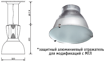 Призматический рассеиватель из ПММА. Светильник с металлогалогеновыми лампами комплектуется защитным алюминиевым отражателем* с темперированным силикатным стеклом.