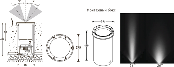 Встраиваются в грунт с помощью пластикового монтажного бокса (поставляется в комплекте)