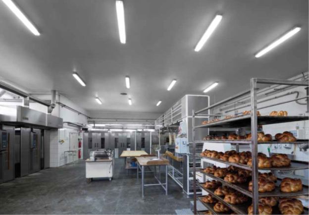 Для освещения помещений пекарни отлично подходит система подвесных трубчатых светильников с прямым распределением светового потока, такая как Prom. При потребности в большей вертикальной освещенности зоны зрительной задачи такую систему можно дополнить светильниками с асимметричной кривой распределения излучения. В пекарнях с высокими потолками лучше использовать подвесные светильники с кривой распределения силы света большого радиуса и металлогалогенные лампы. Все светильники должны быть защищены небьющимся корпусом, во избежание падения осколков на рабочую поверхность при повреждении источника света. Необходимо использовать уровень защиты светильников IP 50. Отличным решением с точки зрения безопасности являются светодиодные источники света. По сравнению с традиционными источниками, светодиодные источники света содержат очень малое количество опасного вещества (ртути). Кроме того, ртуть находится в твердом состоянии, поэтому в случае повреждения источника света, нет риска загрязнения воздуха в производственных помещениях. В то же время источники света должны обеспечивать правильное различение цветов (например, при выборе ингредиентов или при декорировании), поэтому их индекс цветопередачи должен составлять CRI 80 и более.