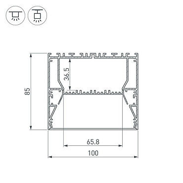 Алюминиевый анодированный профиль для светодиодных лент и линеек. Габаритные размеры (LxWxH): 2000x100x85 мм. Ширина площадки для ленты 65,8 мм. Состоит из профиля и основания для ленты. Для их соединения необходим Фиксатор основания арт. 036434 (приобретается отдельно, 4 шт. на 2 м. профиля). Отсек для БП 64х33 мм. Экраны, заглушки и другие аксессуары приобретаются отдельно. Цена за 1 метр.Другие модели серии