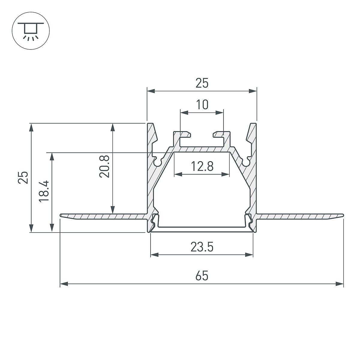 Алюминиевый анодированный профиль для светодиодных лент и линеек. Скрытая установка (под строительную отделку). Цвет - серебристый. Габаритные размеры (LxWxH): 2000x65x25 мм. Ширина площадки для ленты 12,8 мм. Экраны, заглушки и другие аксессуары приобретаются отдельно. Цена за 1 метр.Другие модели серии