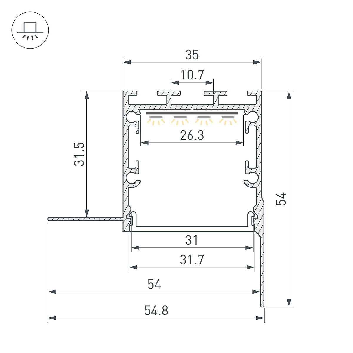 Алюминиевый анодированный профиль для светодиодных лент и линеек. Габаритные размеры (LxWxH): 2000x54,8x54 мм. Паз для установки 35х35 мм. Ширина площадки для ленты 26,3 мм. Экраны, заглушки и другие аксессуары приобретаются отдельно. Цена за 1 метр.Другие модели серии
