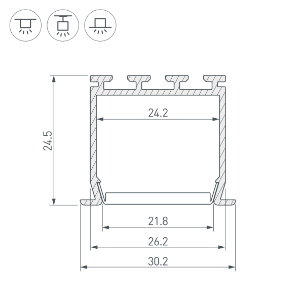 Алюминиевый анодированный встраиваемый профиль для светодиодных лент и линеек. Габаритные размеры (LxWxH): 2000x30x25 мм. Ширина площадки для ленты 22 мм. Экраны, заглушки и другие аксессуары приобретаются отдельно. Цена за 1 метр.Другие модели серии
