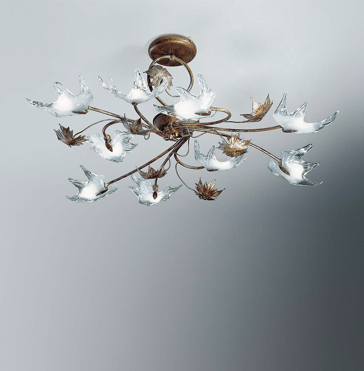 Светильник может быть золотым или коричневым с янтарно-жёлтым или сатинированным стеклом.