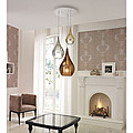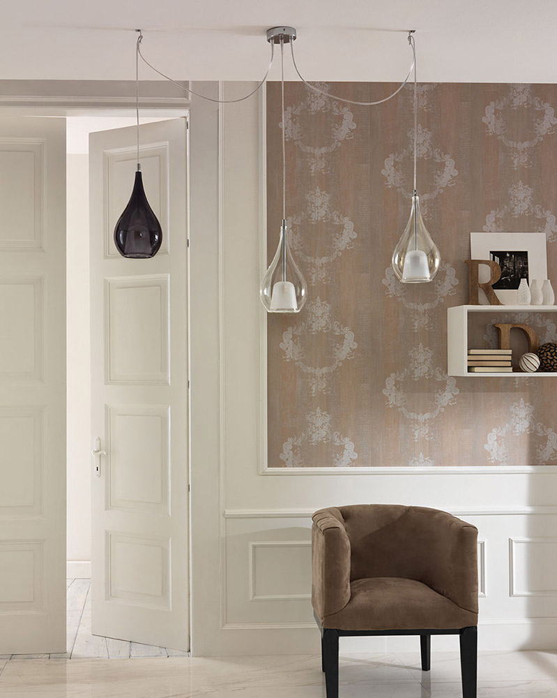 Металлические детали светильника хромированы. Варианты расцветки стекла: прозрачный, розовый, блестящий, янтарно-жёлтый, зелёный, небесно-голубой, дымчато-серый, табачно-коричневый, рубиново-красный. И варианты расцветки стекла с оттенком металлик: красный, чёрный, стальной, золотой, бронзовый, розово-золотой или радужный.
