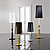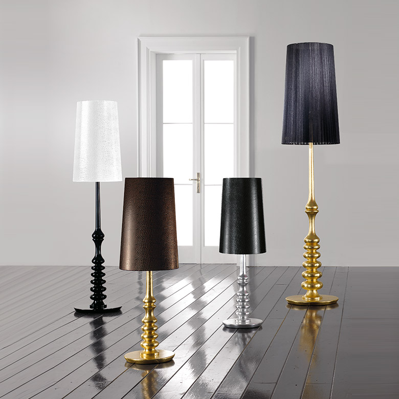 Варианты расцветки светильника: белый, чёрный, серебряный или золотой. Абажуры могут быть из кожи или из органзы.