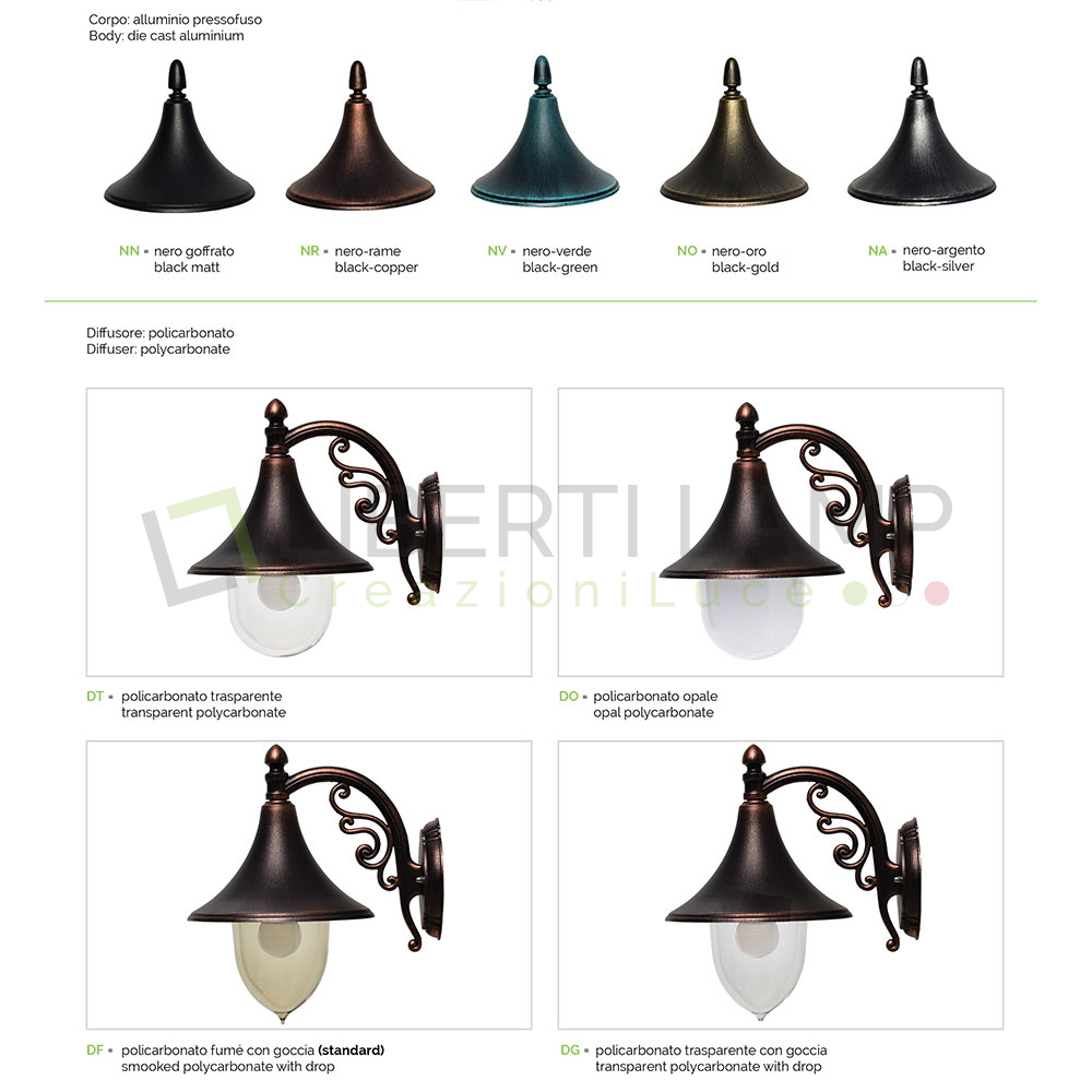 Цвет покрытия светильника: матовый чёрный, чёрный/золотой, чёрный/серебряный, чёрный/медный, чёрный/зелёный.