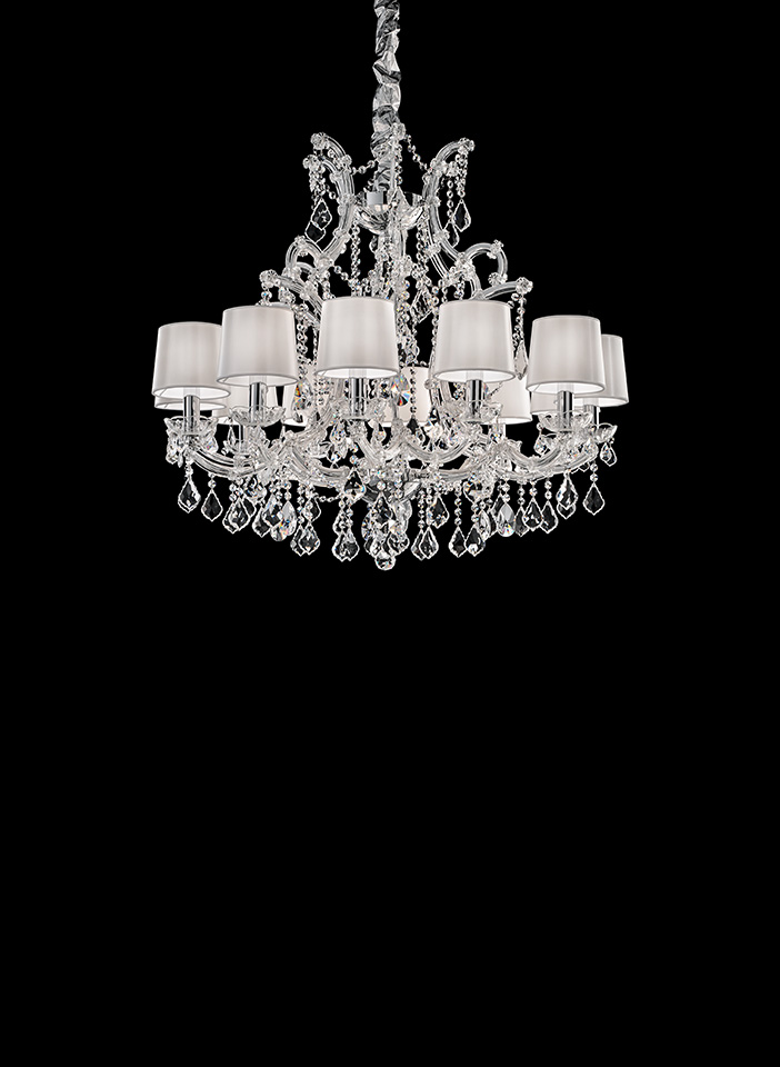 Подвески и стеклянные детали могут быть из прозрачного стекла, прозрачного хрусталя, прозрачных кристаллов SWAROVSKI или из цветного стекла. Основание покрыто хромом или золотом. У версии светильника с цветным стеклом основание может быть окрашено в разные цвета.Все модификации люстры Masiero MARIA TERESA VE 915