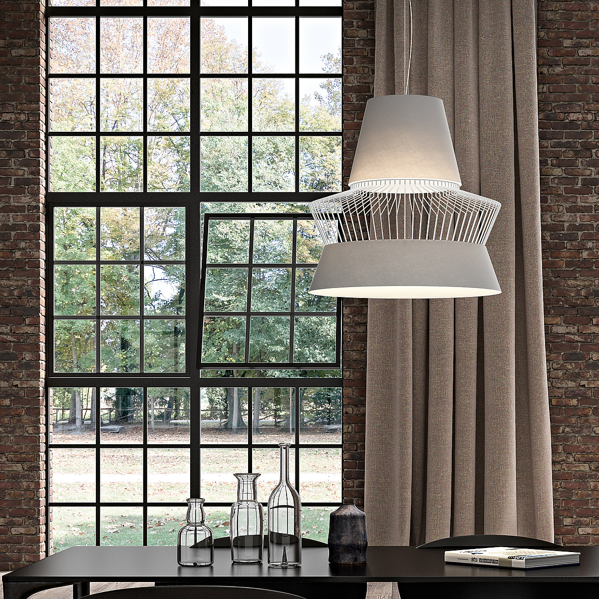 Варианты отделки светильника: чёрный никель, тёмная медь, матовый белый цвет. Абажур может быть светло-серым или тёмно-серым.